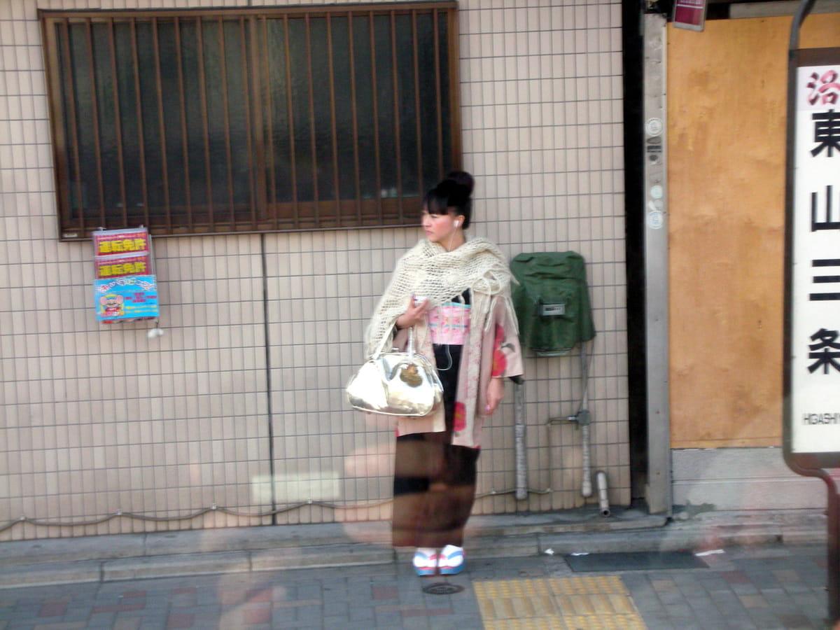 京都街上穿和服的女孩,当她发现我们在拍她的时候,冲着我们笑了一下,可惜没抓拍到