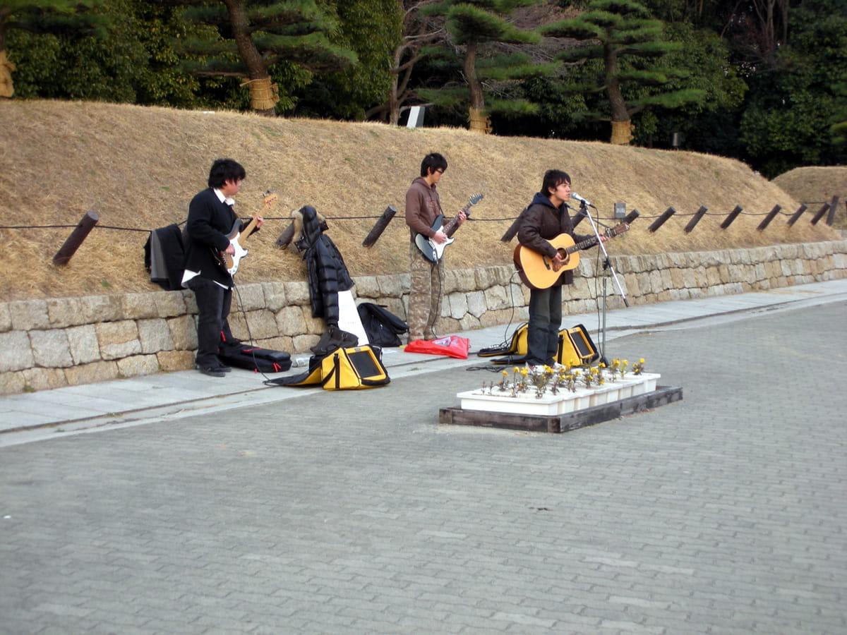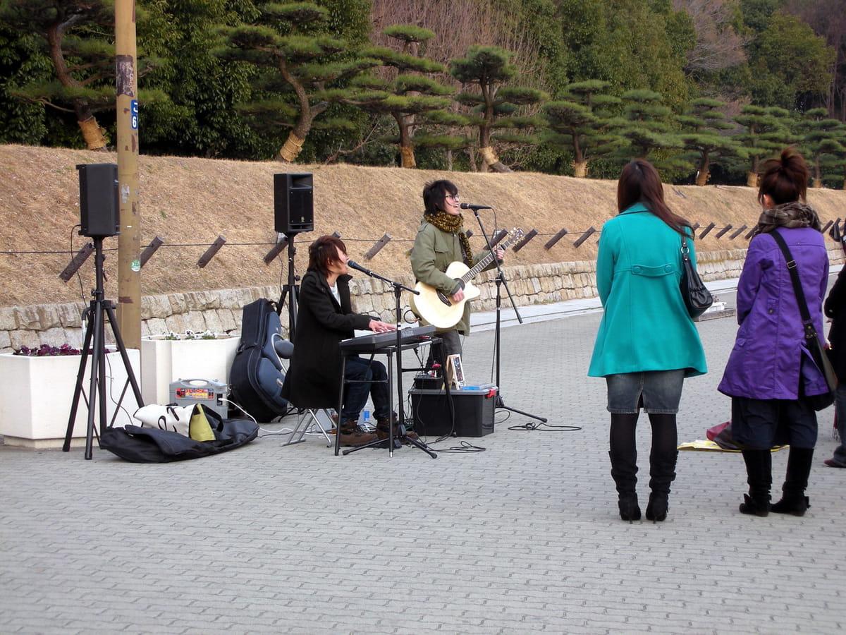 路上有乐队在表演,吸引了很多女生驻足,6,7个。似乎只有女生