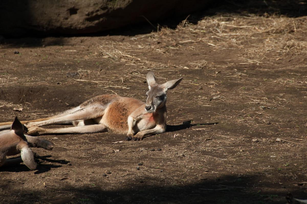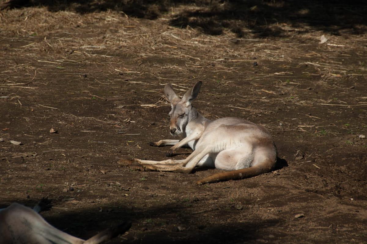 一群袋鼠躺在地上晒太阳,样子十分搞笑,真应该给它们戴上墨镜,眼睛都眯成一条缝了。