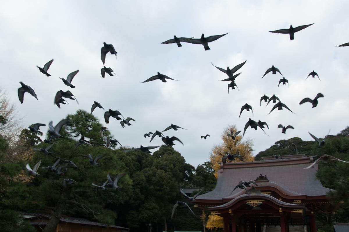 屋顶上一群鸽子飞了起来,从头上飞过,抓拍。