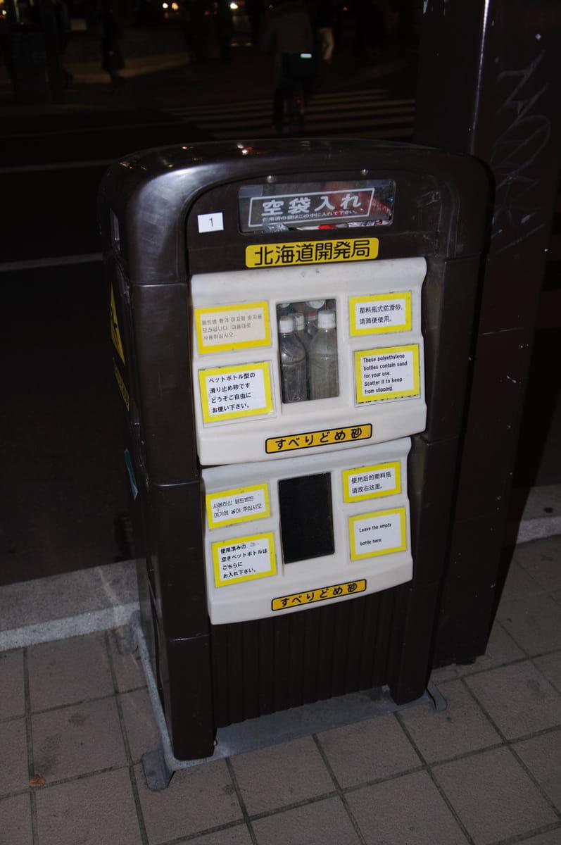 知道这个是什么吗?一开始我以为是垃圾桶,仔细看了一下,原来是防滑沙,冬天的时候地上的冰雪会很滑,从这里面拿出来一袋沙子撒在地上就OK了。估计这是北海道特有的东西。