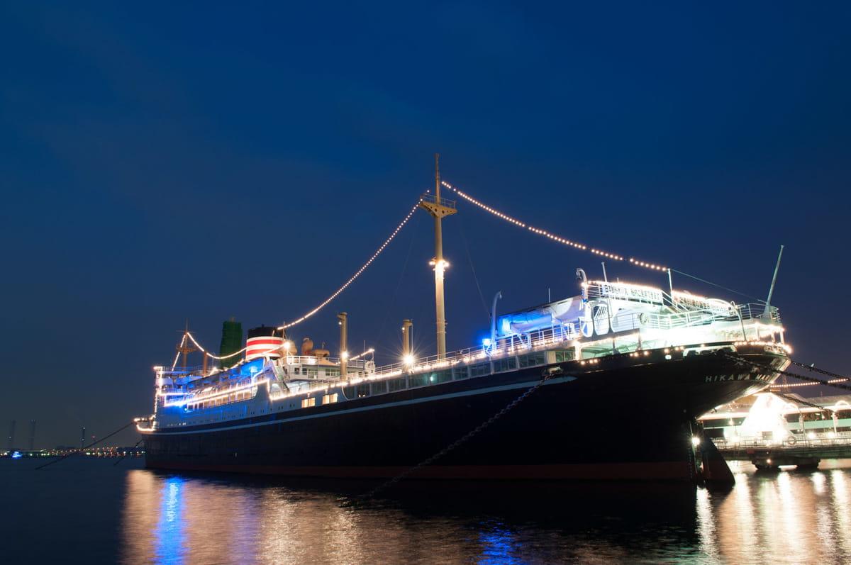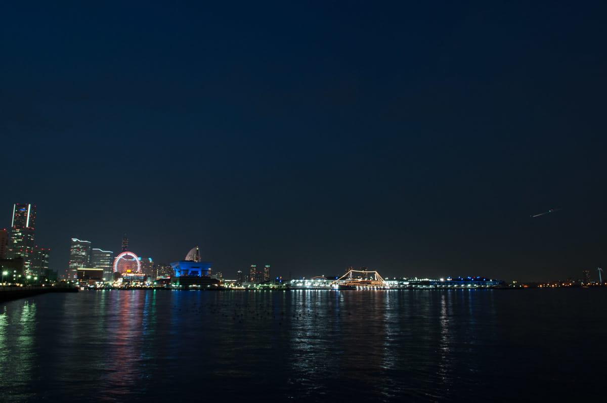 横滨港的夜景,照片中红色的圆圈就是横滨cosmo world的那个巨大的摩天轮,虽然在这张照片里看起来很小。