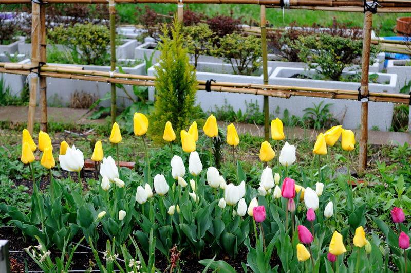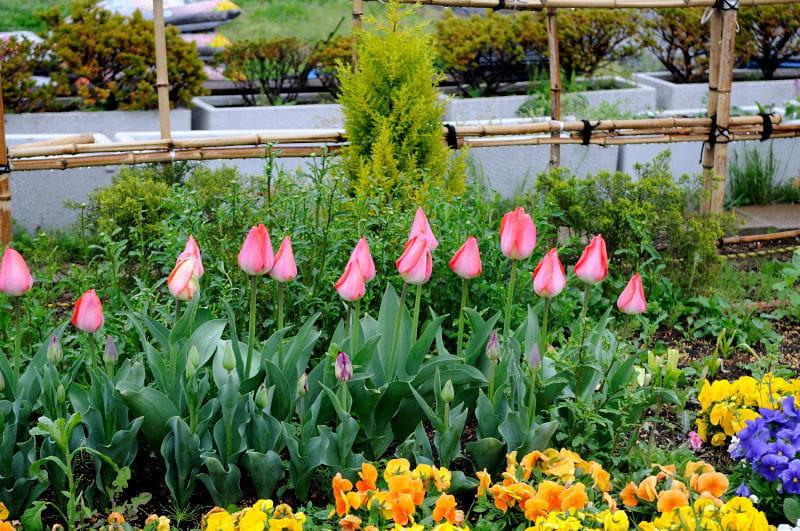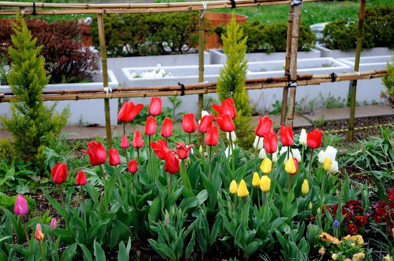 所幸的是,校园里广场旁,开辟了一片花坛,郁金香开的很美。