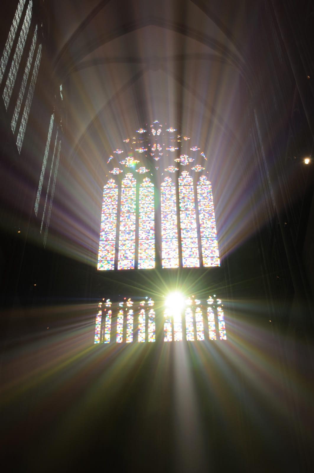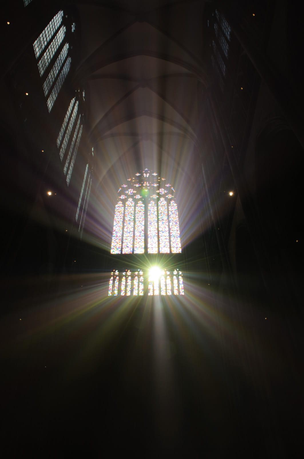 因为是星期天,教堂里在做弥撒。薰香燃烧产生的颗粒悬浮在空气中,在阳光的照射下产生了丁达尔现象