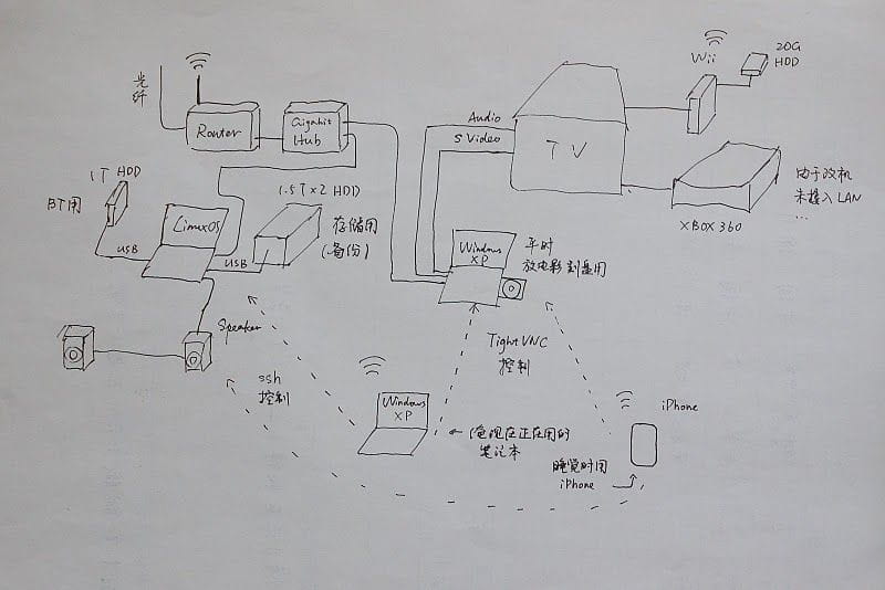 阶段2:学校淘汰下来的旧电脑,P4双核2.0GHz,1G内存,USB插了2个硬盘盒,2T+1.5T×2 = 5T。系统没变。这是当时画的家里网络的示意图。