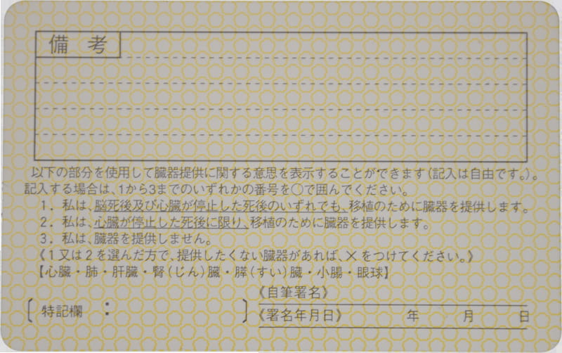 日本驾照的反面,那个123选项是关于器官捐献的个人意愿(脑死就捐,心脏停止死后捐或是不捐),在驾照上写这个东西,觉悟真的很高,但是感觉不太好……
