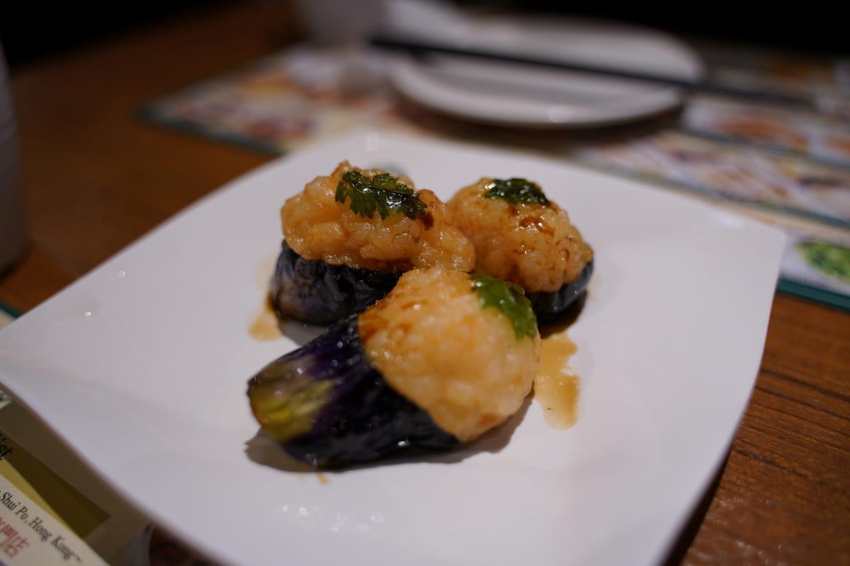 百花煎釀茄子,上面是虾和面制成的,茄子嫩而多汁,★★★★