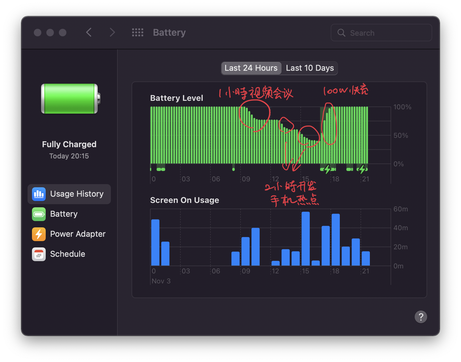 早上一个 1 小时的视频会议,大约用掉了 20% 的电。下午用了两个小时写代码,全程使用手机热点,最后剩了 47% 的电量。晚上回家用 100W 快充大约 40 分钟充满。